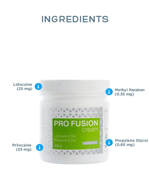 Pro Fusion cream contains lidocaine and prilocaine, active ingredients that help numb the skin. It is a topical anesthetic cream that can be applied directly to the skin to help a patient feel less pain.